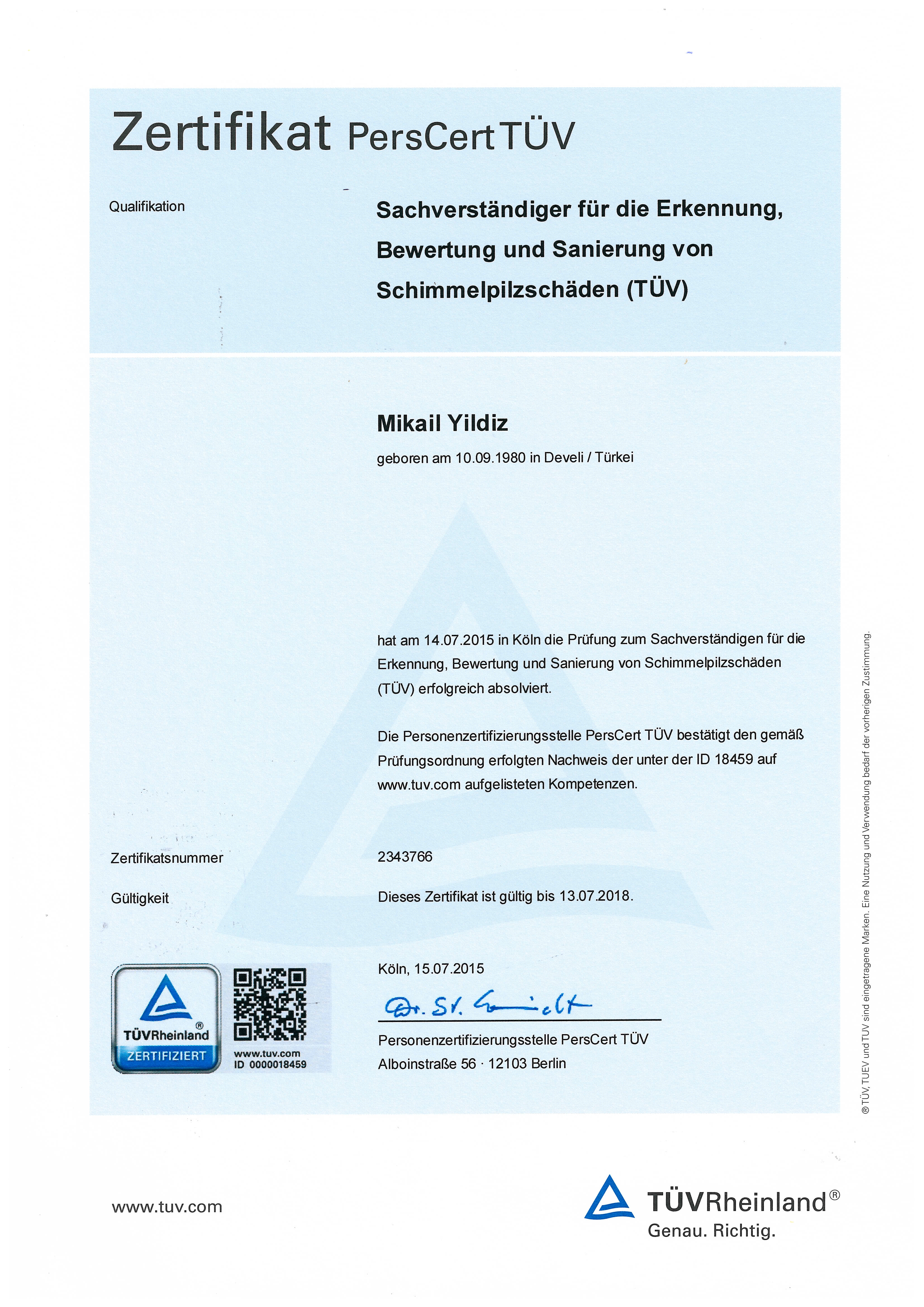 Wir sind TÜV-Zertifizierte Sachverständige zur Erkennung, Beseitigung und Sanierung von Schimmelpilzschäden.
